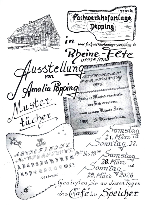 Die in der Ausstellung von Amalia Pöpping gezeigten Werke sind an Variantenvielfalt kaum zu übertreffen. Die Einzigartige Sammlung wurde von Ihr über mehrere Jahrzente hinweg gesammelt, aufbereitet und liebevoll zusammengestellt. Viele dieser Mustertücher stammen aus Ihrer eigenen Famile, aus Haushaltsauflösungen, sowie aus Geschenken von diversen Privatbesitzern.