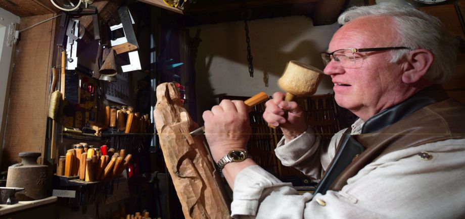Die scharfe Klinge gleitet über das harte Eichenholz. Hinterlässt Spuren, tiefe Narben. Heinz Pöpping ist in seinem Element. Der passionierte Holzschnitzer und Krippenbauer steht in seiner Werkstatt auf seinem Fachwerkhof in Rheine-Elte und bearbeitet einen Klotz aus altem Holz. „Fassen Sie mal an, so glatt. Das ist Spiegeleiche", schwärmt der Künstler.